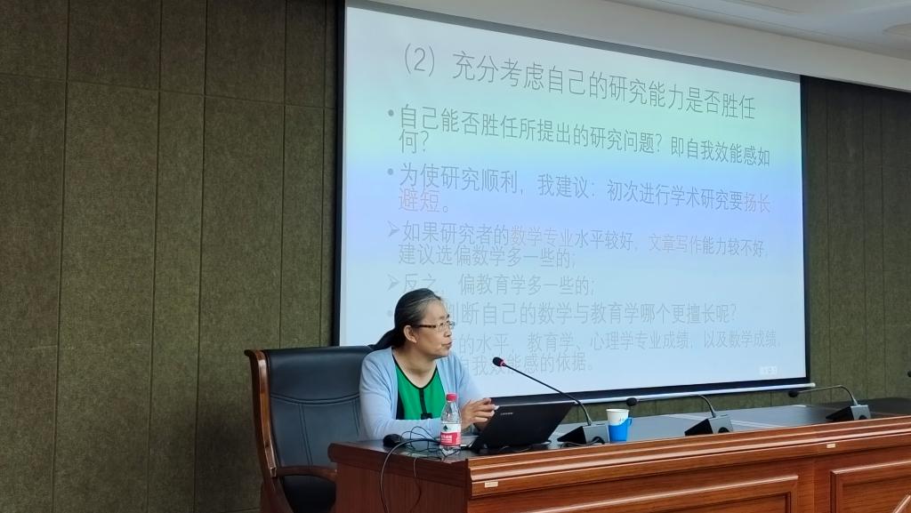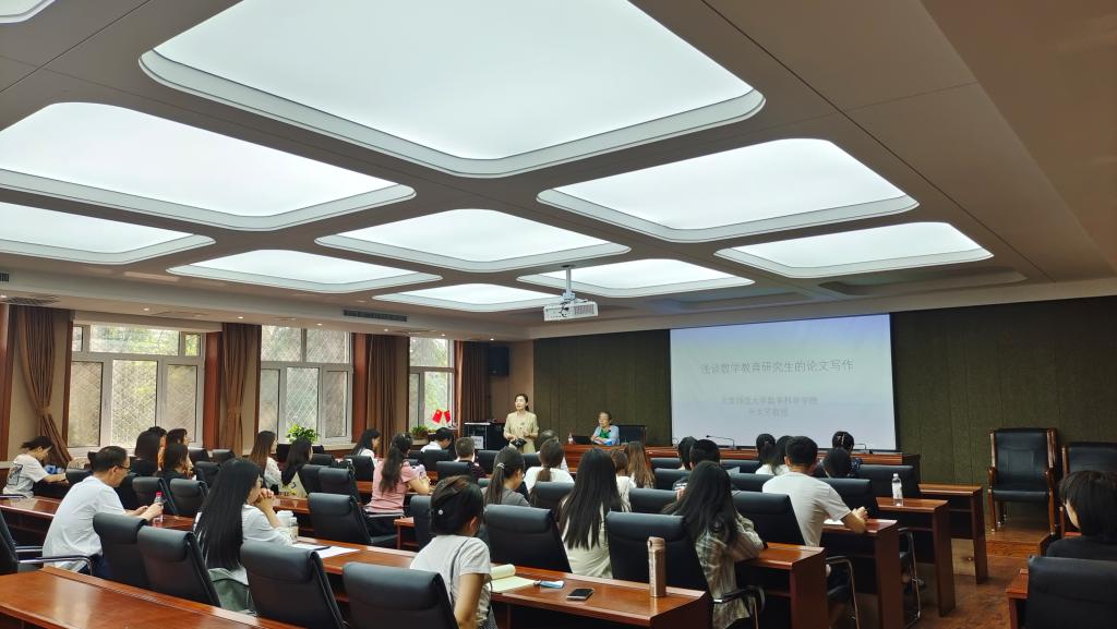 6月18日,新捕京官网特邀中国教育学会中学数学教学专业委员会副理事长、学术委员会副主任、北京师范大学博士生导师朱文芳教授作了题为“浅谈数学教育研究生的论文写作”的学术讲座。讲座由新捕京官网李春兰教授主持,参加本次讲座的主要有新捕京官网领导、老师、数学教育方向的硕士研究生、硕士研究生实践导师、其他学院的师生。
