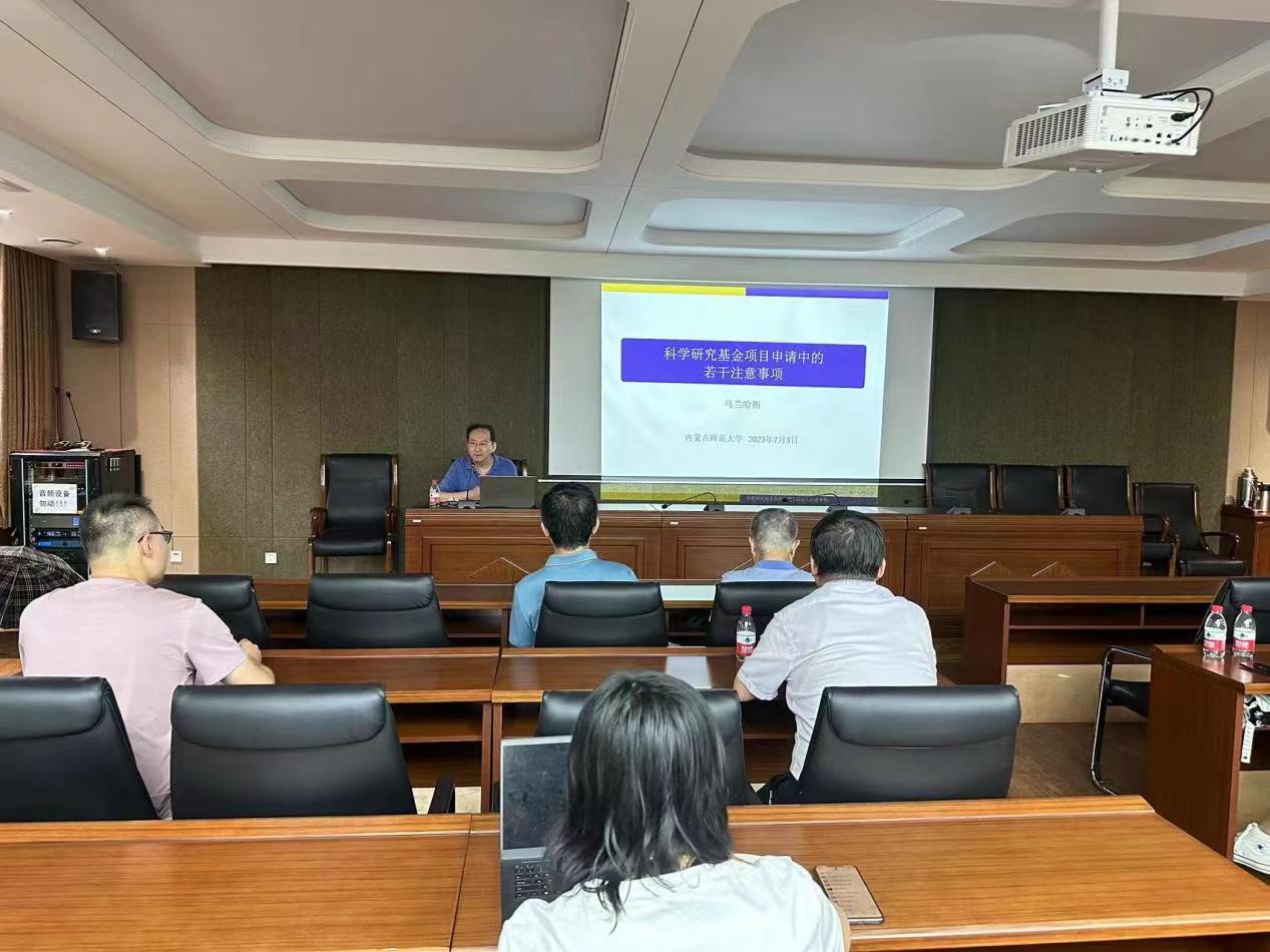 7月3日下午,应新捕京3522com邀请汕头大学教授、新捕京3522com特聘教授乌兰哈斯先生作题目为“科学研究基金项目申请中的若干注意事项”的学术讲座。出席本次讲座的有刘官厅教授、扎其劳院长、包霞副院长以及新捕京官网部分教师。